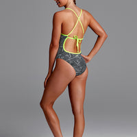 The one piece style that criss crosses down your back offering you the flexibility to tie it just the way you like. With a moderately high cut leg it’s the perfect style to strap in for a hard session in the pool or relax when you’re poolside.