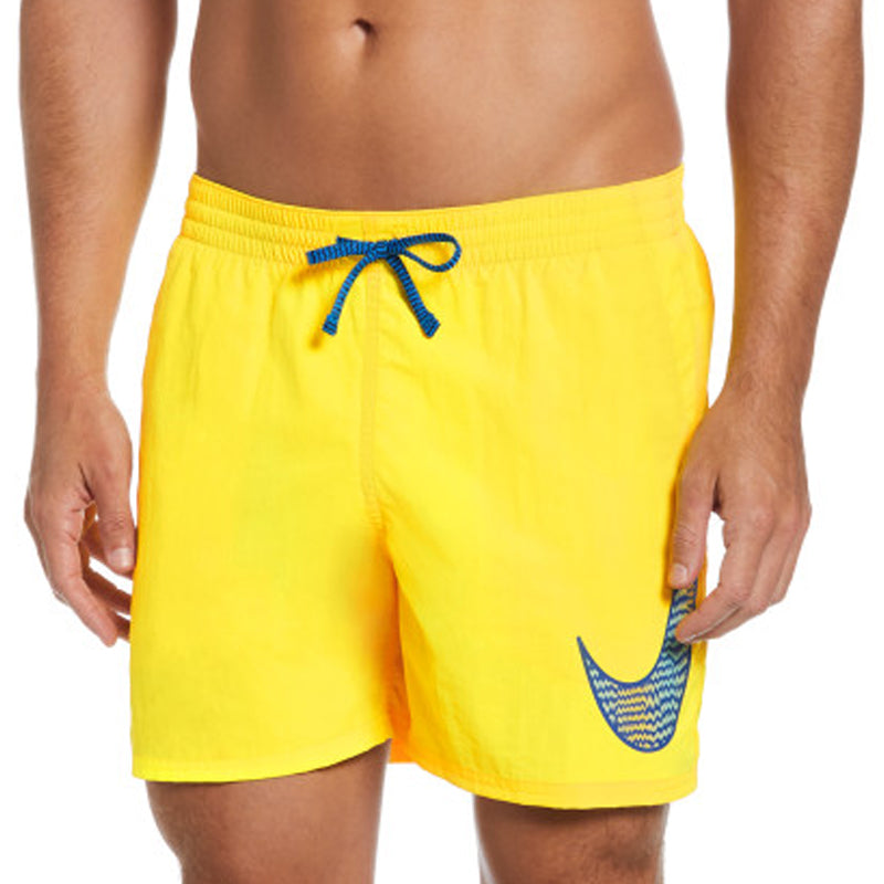 Made with at least 75% recycled material to help reduce waste, these volley shorts from Nike are swimming trunks you can feel good about wearing. They have a drawcord-adjustable stretch waistband to keep them in place, while a built-in mesh brief helps to provide breathable support. The men’s swim shorts are made with a durable plain weave fabric that stands up well to regular wear, and they're equipped with convenient pockets featuring mesh bags that drain out easily once you leave the water. A large Nike Swoosh is printed on the side, filled with a zigzag pattern for eye-catching style.