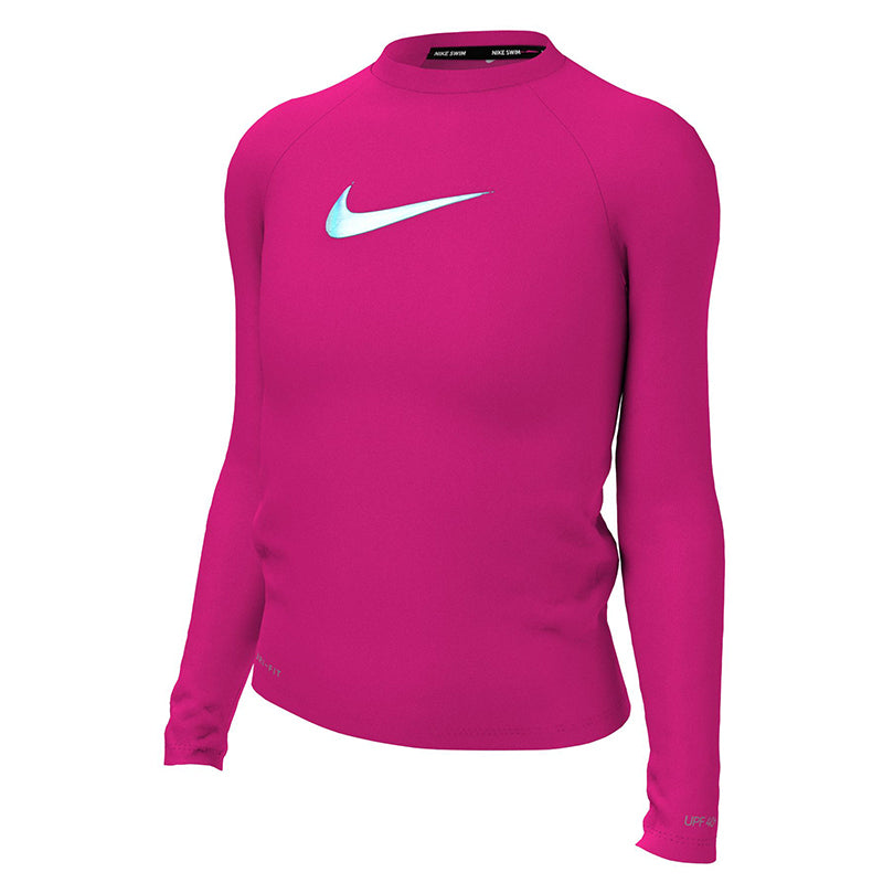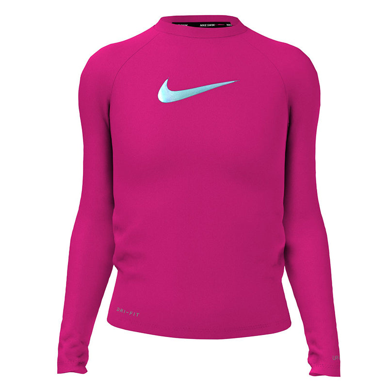 This Girl's Nike Swim Swoosh Long Sleeve Hydroguard will keep her protected while she enjoys swimming and playing outside. Dri-FIT technology wicks moisture away from the body to help her stay dry quicker and stay comfortable. The raglan-sleeved swim top offers UPF 40+ sun protection and has internal neck tape on the seams for extra comfort. (NESSB747)