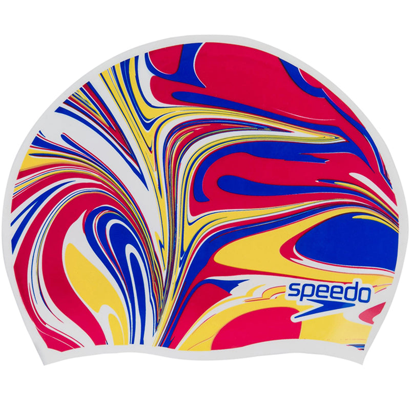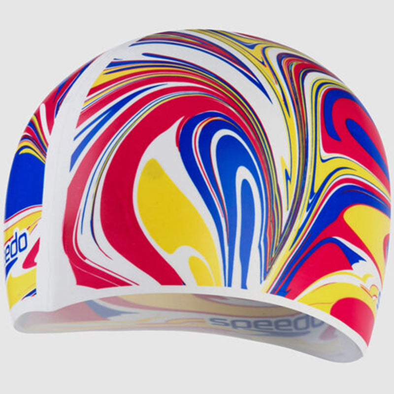 Be bold in vibrant colours and prints! Young swimmers will love our colourful slogan swim cap, featuring a hyper-bright, marble-effect print inspired by soundwaves on water