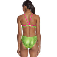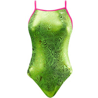 The Gatsby Foil Funnies Wing Back Swimsuit utilizes a sleek Poly/Spandex fabrication with a shiny foil finish to provide performance in and out of the water.